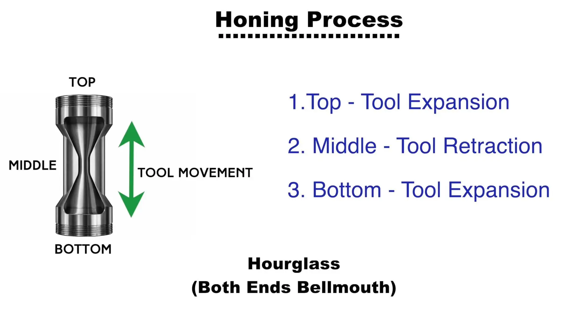 This staged honing approach ensures that the hourglass profile is produced intentionally and repeatably.